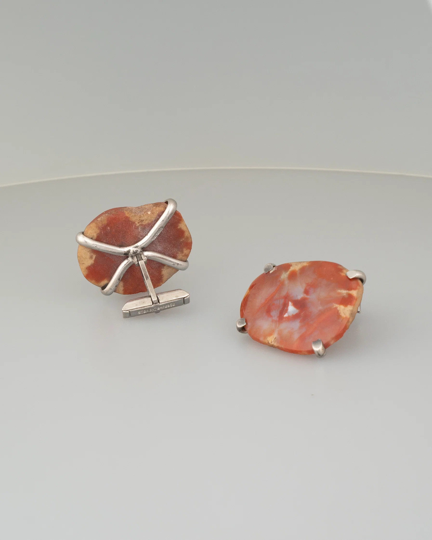 a fantastic studio crafted pair of quadra-prong gripped slabby red moss agate cuff links with patented spring tension closures.