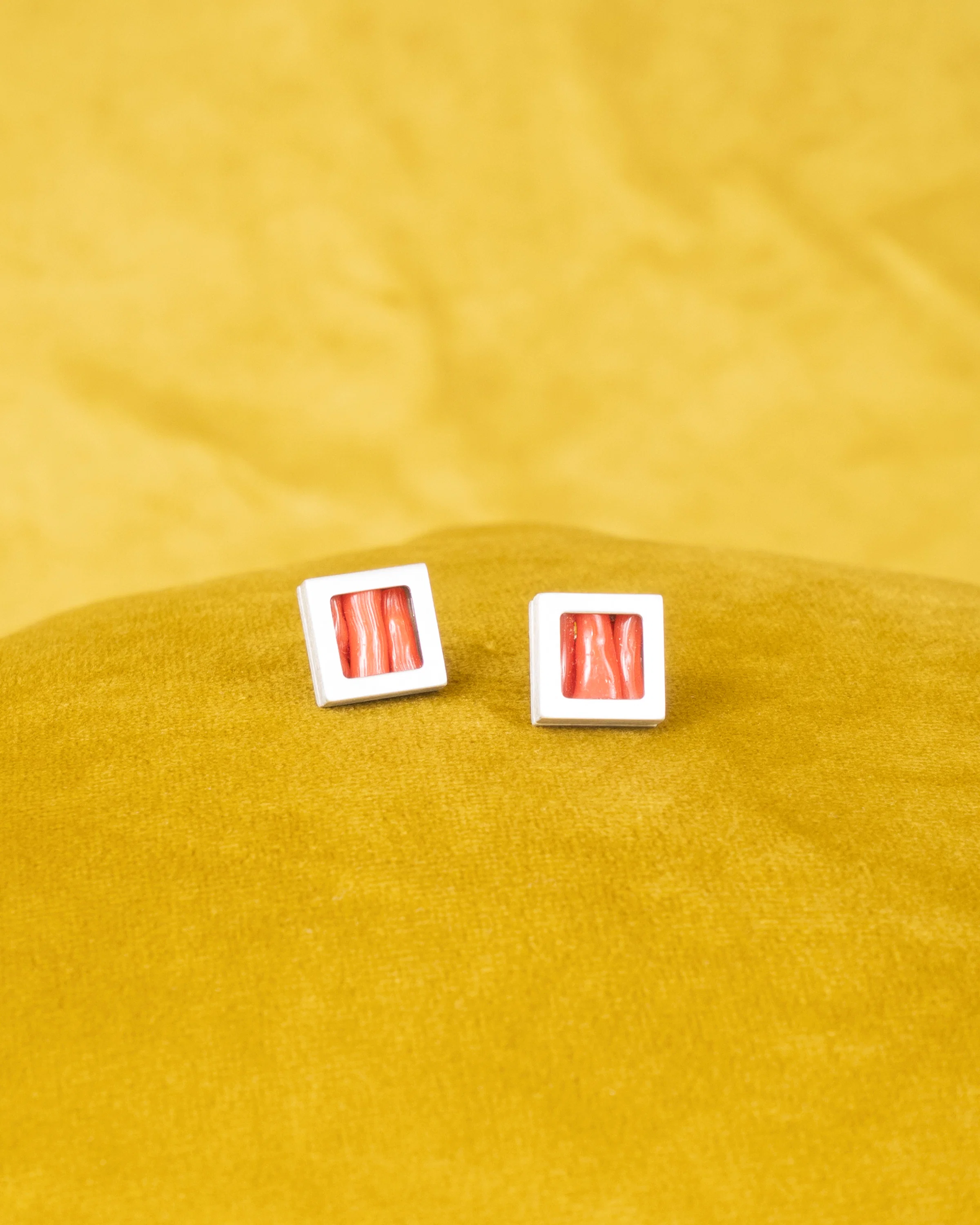hand crafted petiteĀ matte-brushed lidded stud earring boxes containing precious assemblages of red coral bits.Ā