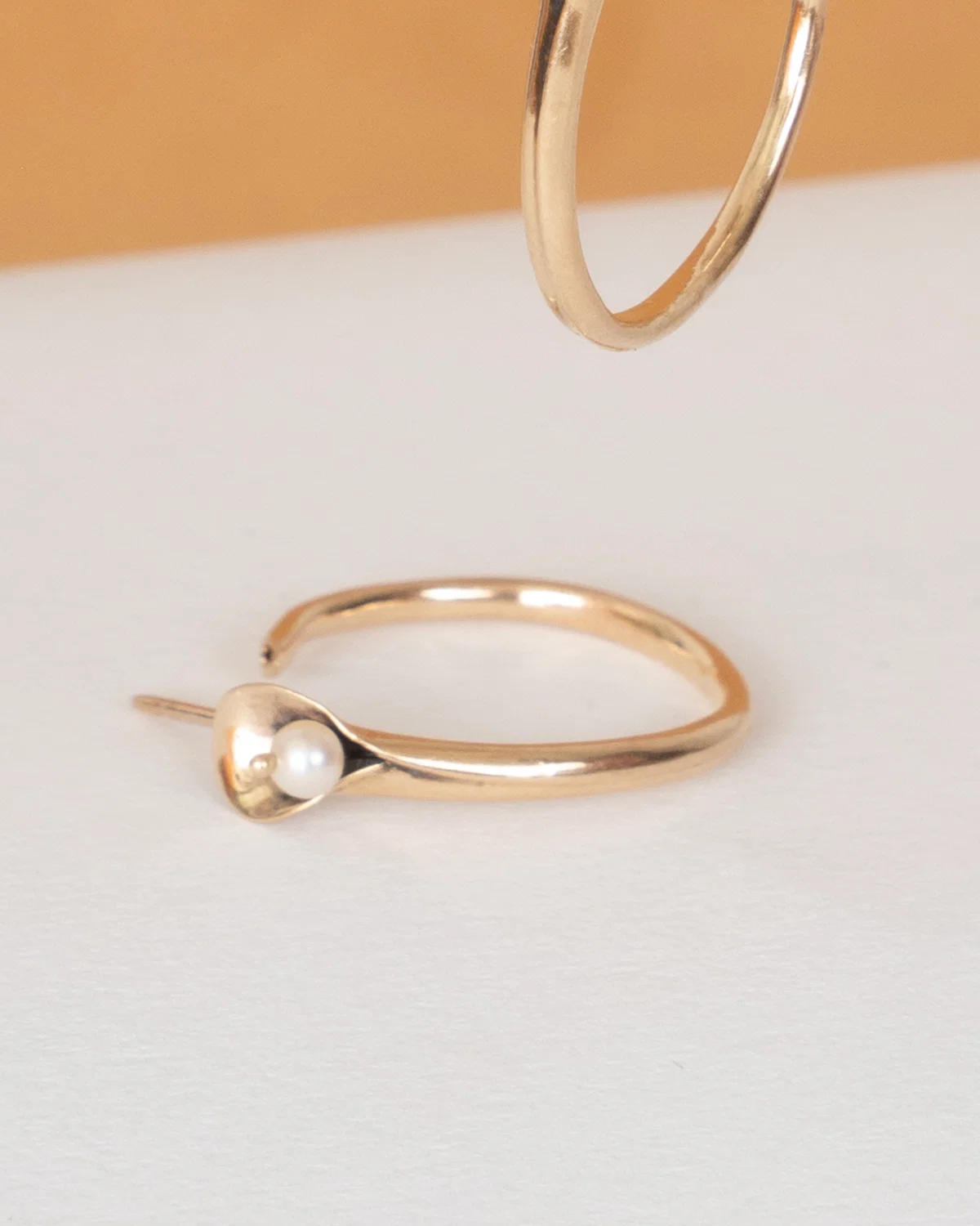 a pair of post modern stud hoops crafted of solid curled hammered 14k gold, blossoming to feature a pearl at the lobe.Ā