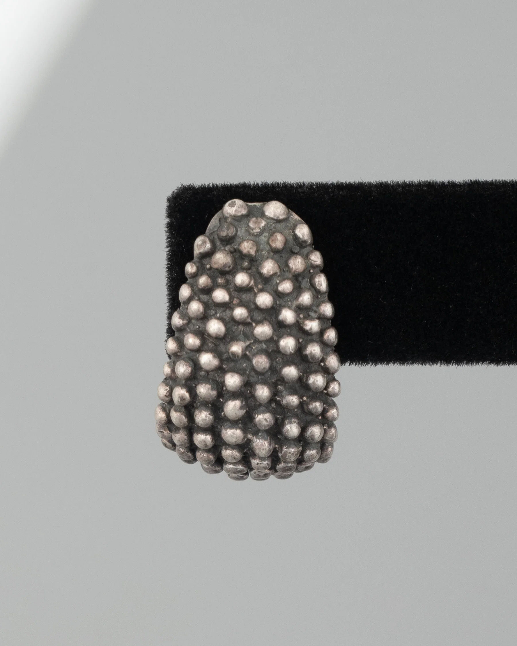 a postmodern brutalist mannered sterling silver pair of drip textured half hoop earrings with intentional patina.Ā