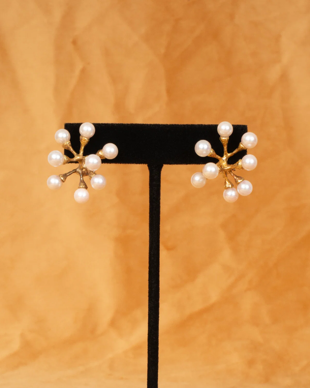 an impressive pair of solid 14k gold studio crafted twiggy bursts with orb pearl buds. each featuring eight shimmery champagne pearls. these earrings hold the lobe via stud backs with built in lever tension grips.