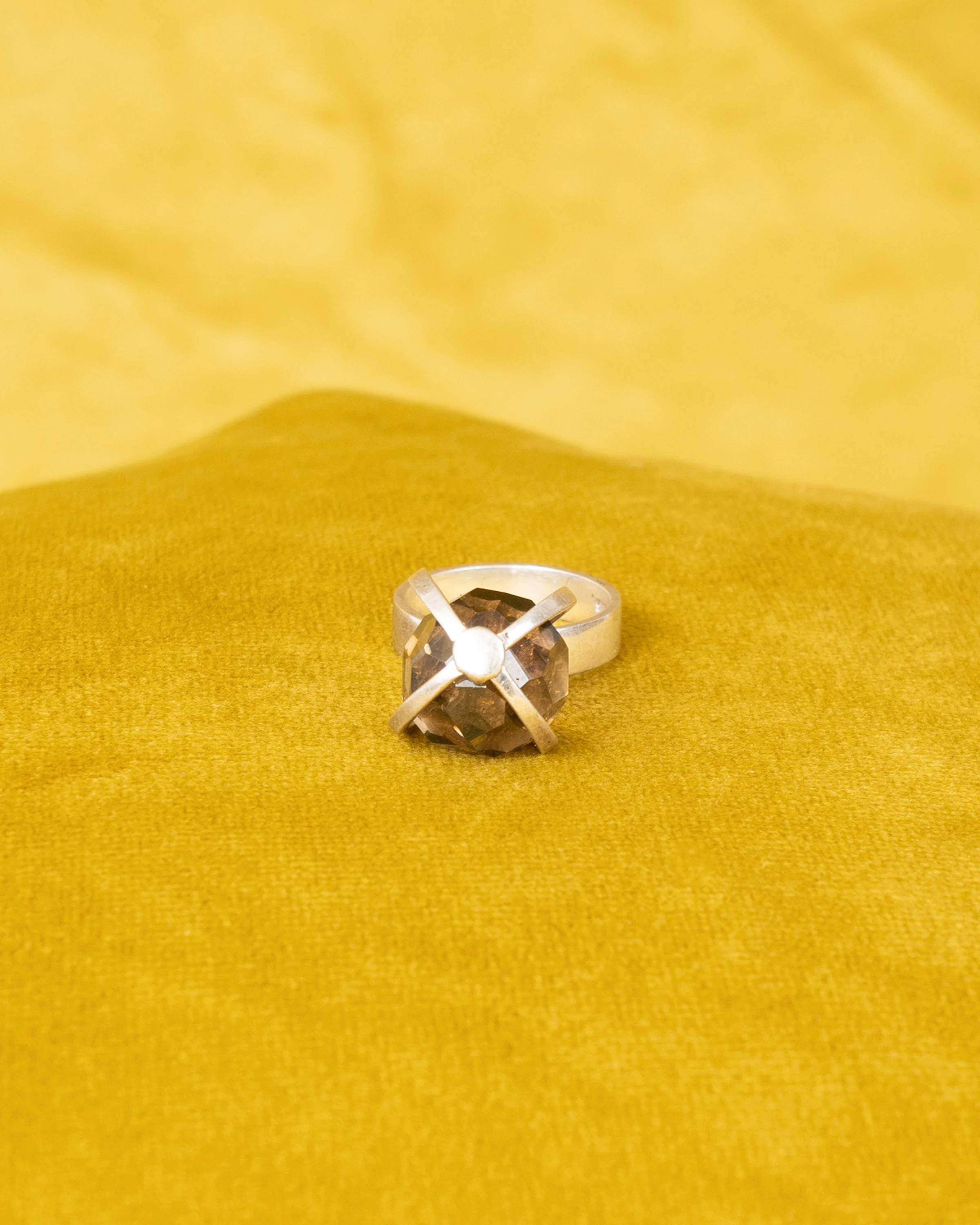 a modernist jumped up solid silver bar crafted orb cage trapping a multi-faceted sphere of smoky quartz.