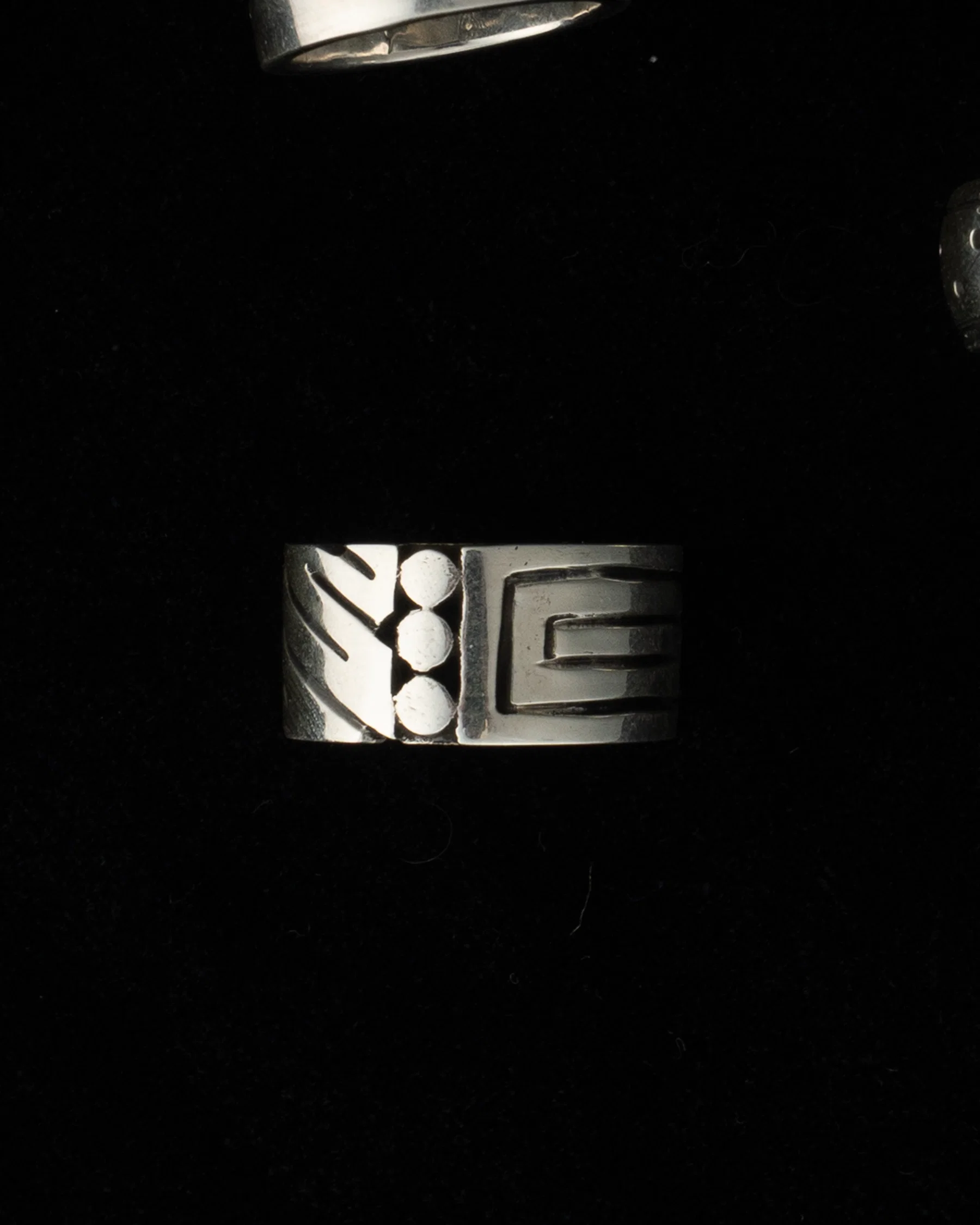 A weighty and cozy cigar band with hand carved multi patterned motif: dots, zig zags and a square edged spiral. this two layered solid sterling classic design is likely fromĀ William Spratling's second design period c.1947-1951.Ā
