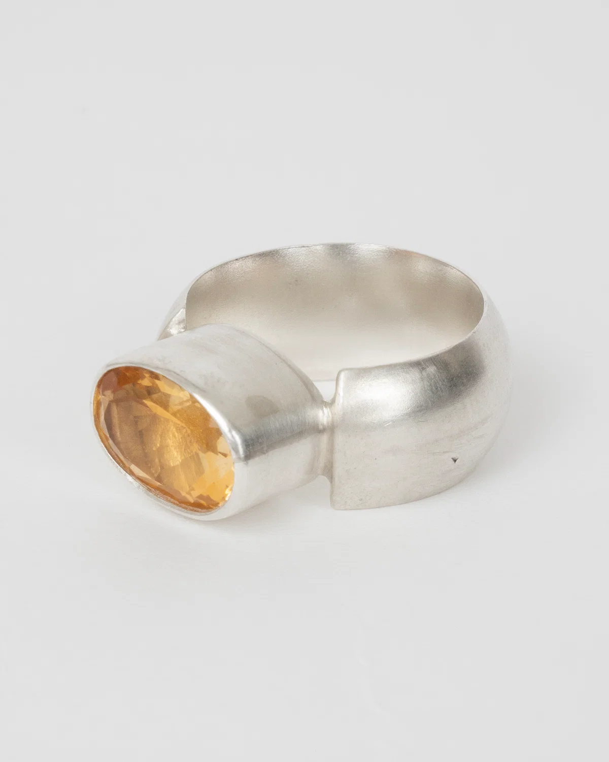 a solid sterling silver hard sliced half round band pinching a thick cupped bezel set hand cut honey-toned citrine gem.