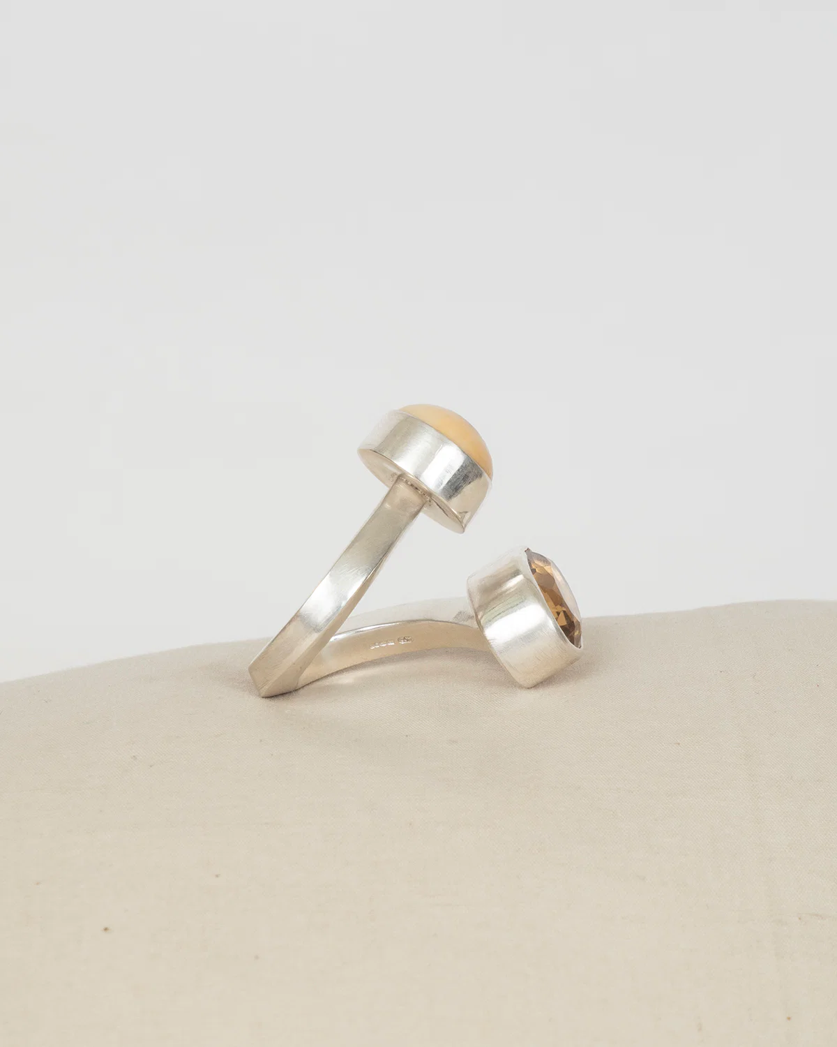 a solid sterling silver square rod bypass ring with two deeply bezel set features: a hand cut 1950s ovule of cognac citrine and a round cabochon of walrus tusk.