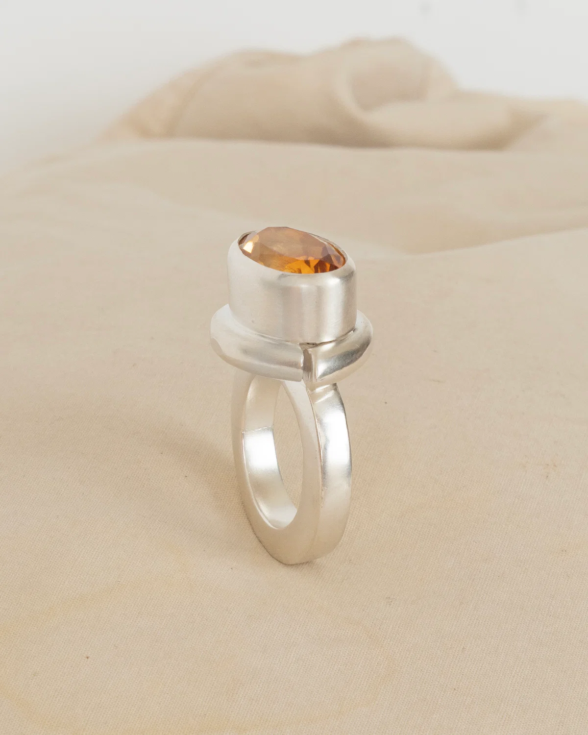a soft square rod ovule band with a deep bezel set hand faceted 1950s golden blazed citrine gem wrapped in a sliced round rod perched on end.