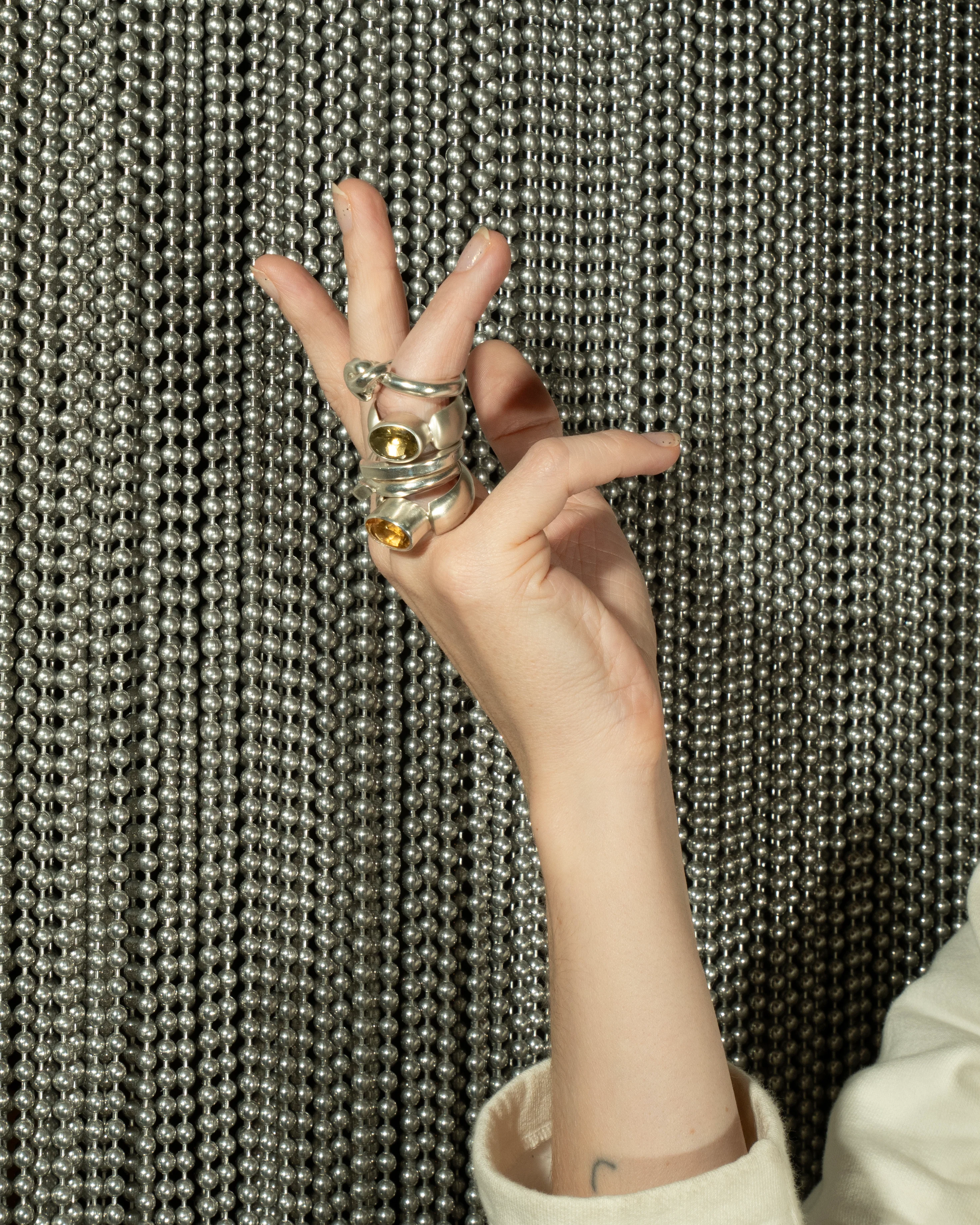 a solid sterling silver soft tipped half round band pinching a thick cupped bezel set hand cut lemon citrine gem.