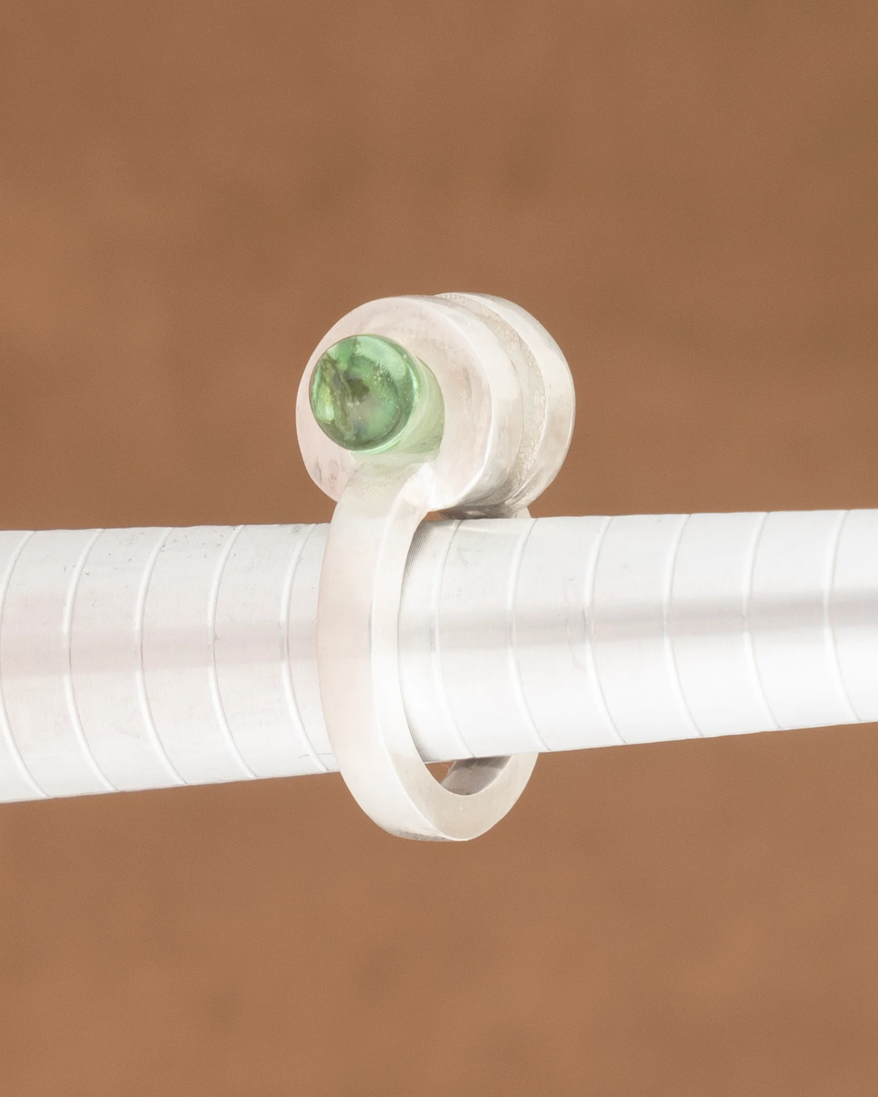 a square-edged sculptural ring in solid sterling with a double loop trapped but wiggly soft tipped barbell of pale green studio glass with varied inclusions.Ā