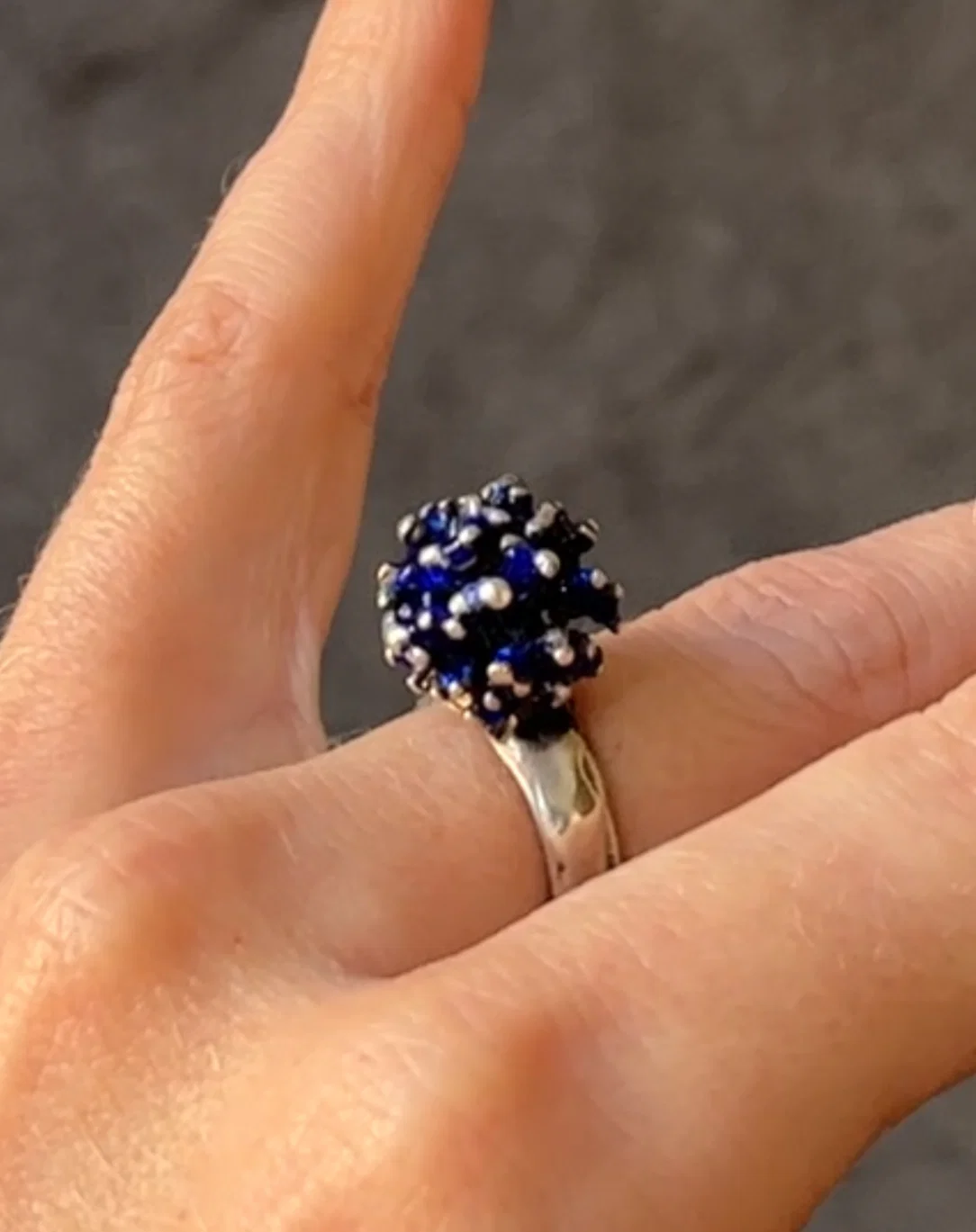 a blue enameled brutalist amorphic "pom-pom" cluster perched on an adjustable irregular melty band