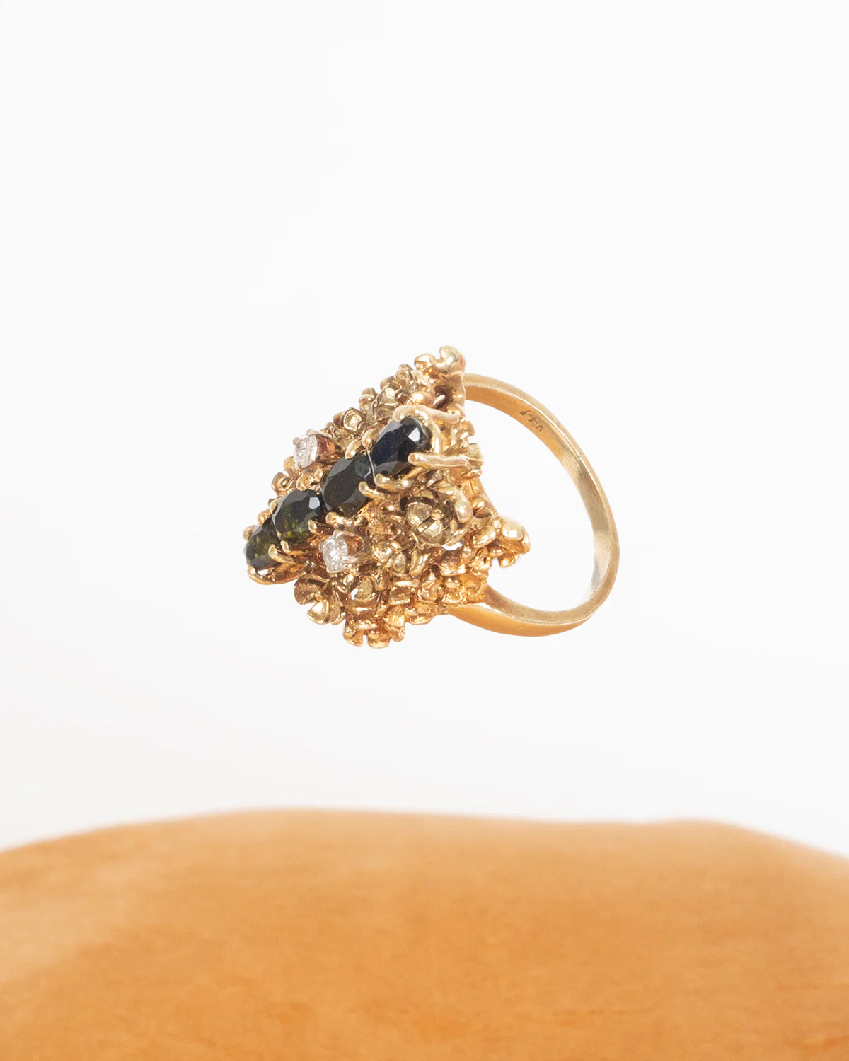 a maximalist solid gold flower garden, a crunchy brutalist piece of sorts, with a central pronged up row of deep green tourmaline oval cut gems flanked by two deep pronged diamonds - stunning.