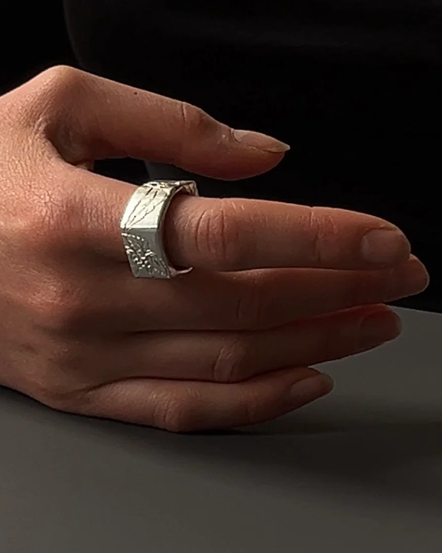 a solid sterling silver hand carved double signet ring with all-over nettle motif.