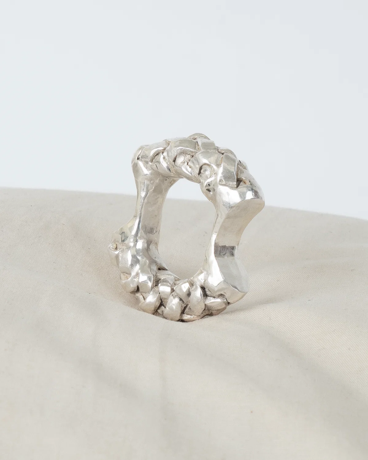 Zoé's jumbo flat web woven solid sterling silver spin on the OJ D00 BITE IT RING, (a donut ring that is chomped to make room for your fellow fingers). A Zoé Mohm exclusive to OLD JEWELRY.