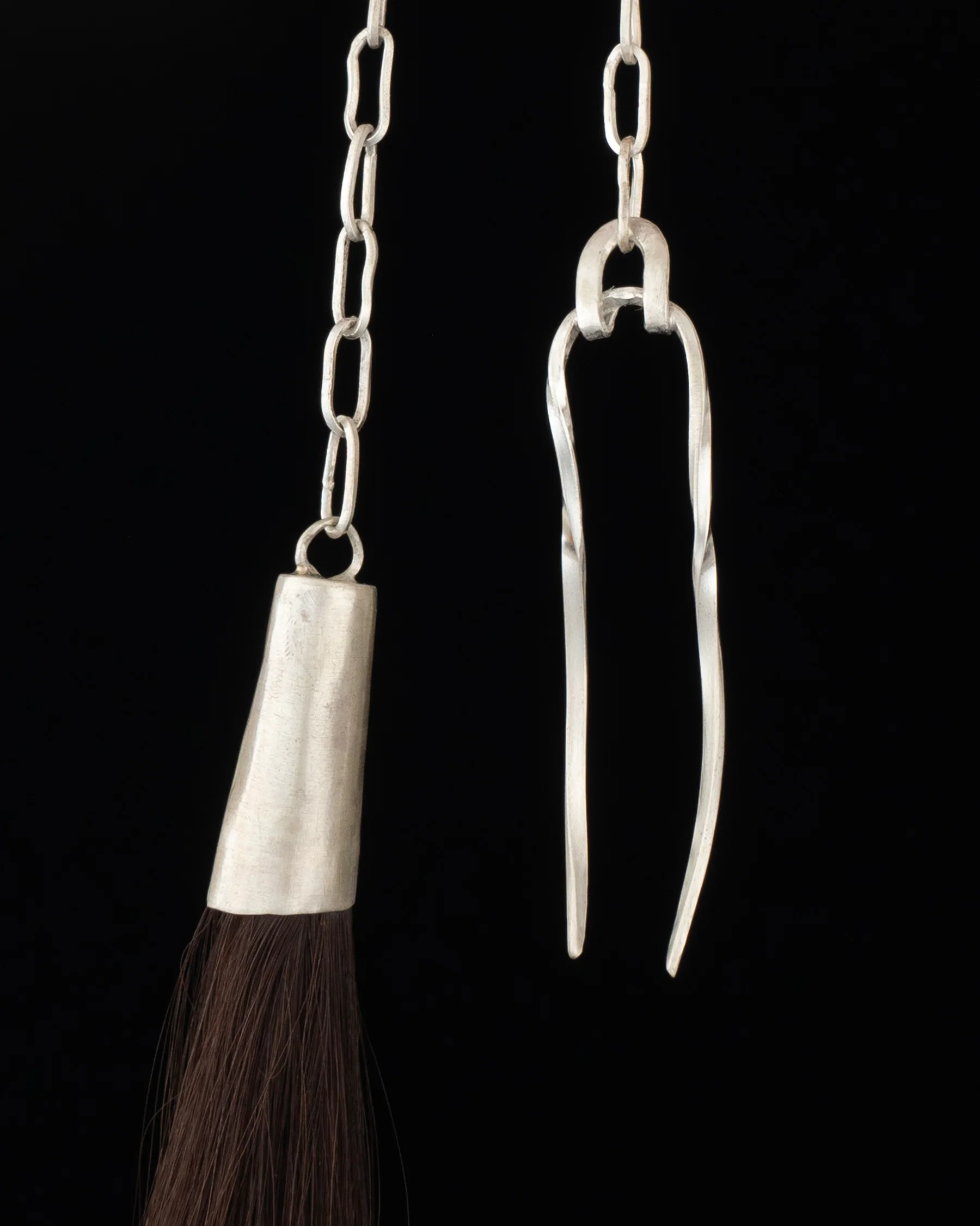 a hand forged solid sterling silver twist rod french hair pin with a ponytail sized chain swaying conically gripped weft wig hair charm.