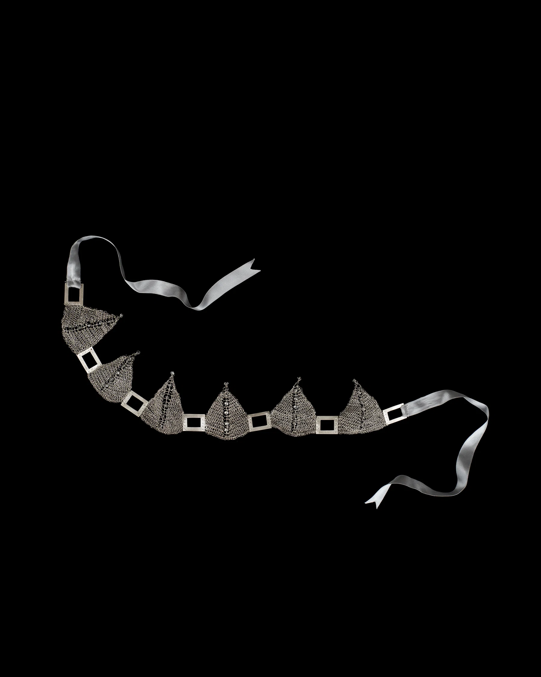 a pale blue-grey silk and meticulously hand knit fine silver crown, adorned with pale smoky quartz beads and hand stitched at the seams.Ā