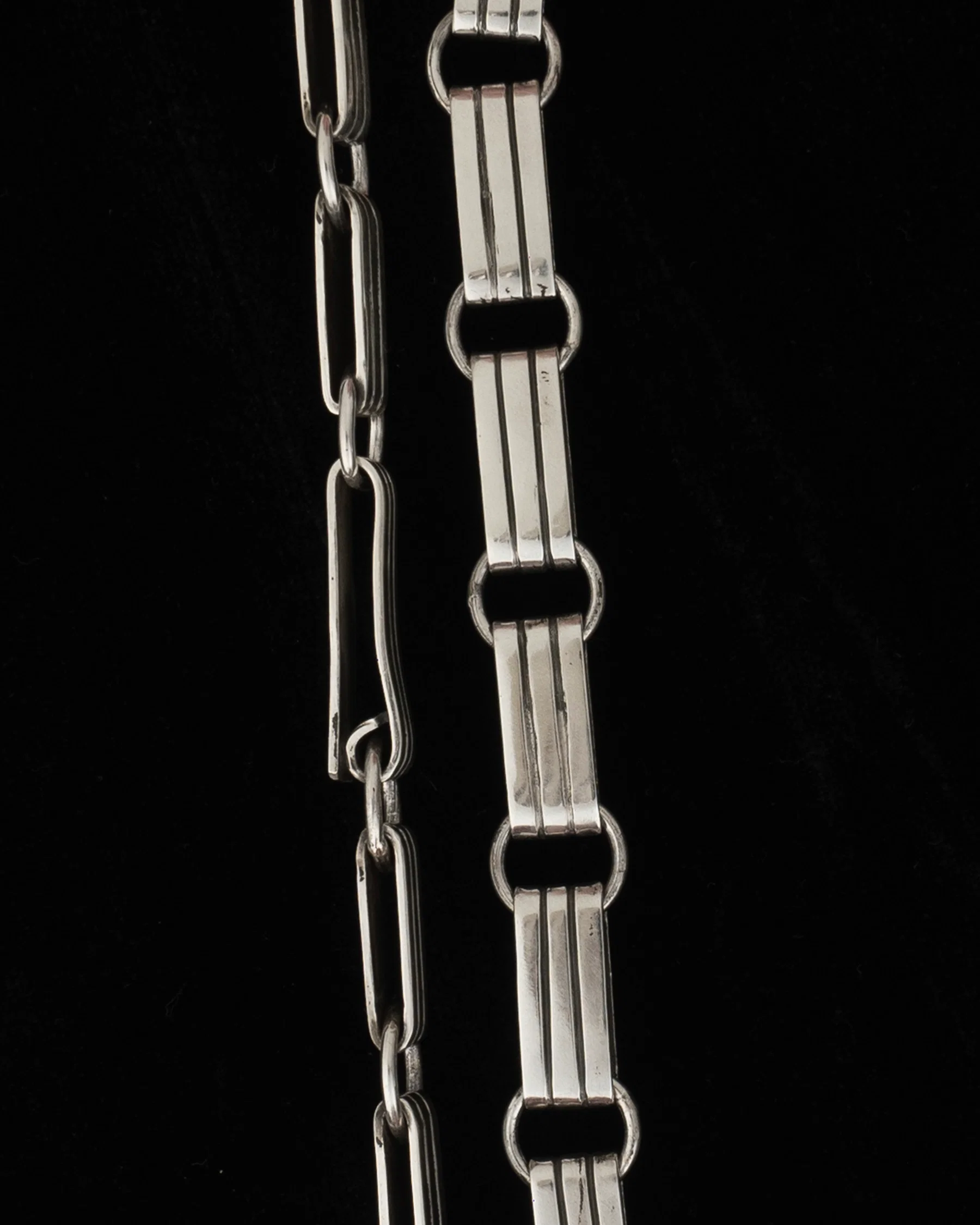 A slippery soft and wide everyday chain necklace comprised of solid sterling silver double ribbon links with a secure and discreetly integrated fish hook closure. This classic ribbon chain design is from William Spratling's first design period c.1931-1946.