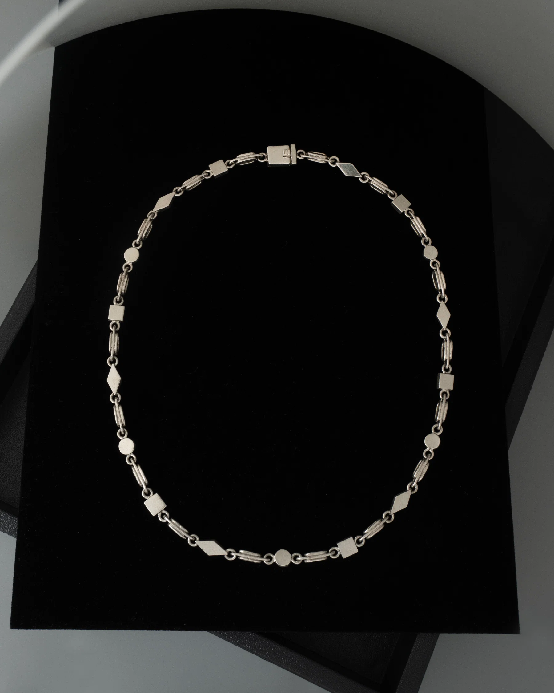 A high polished petite geometric and swirl stacked link solid sterling silver chain necklace - diamonds, circles and squares ornament the length of this chain with a sturdy box clasp closure. This shimmery and playful chain design emerged in the late 50s / early 60s during William Spratling's third and final design period c.1951-1967.Ā The Spratling taller produced a very limited run of geometric chains this year. This is one-of-three in this years allocation to OLD JEWELRY.Ā