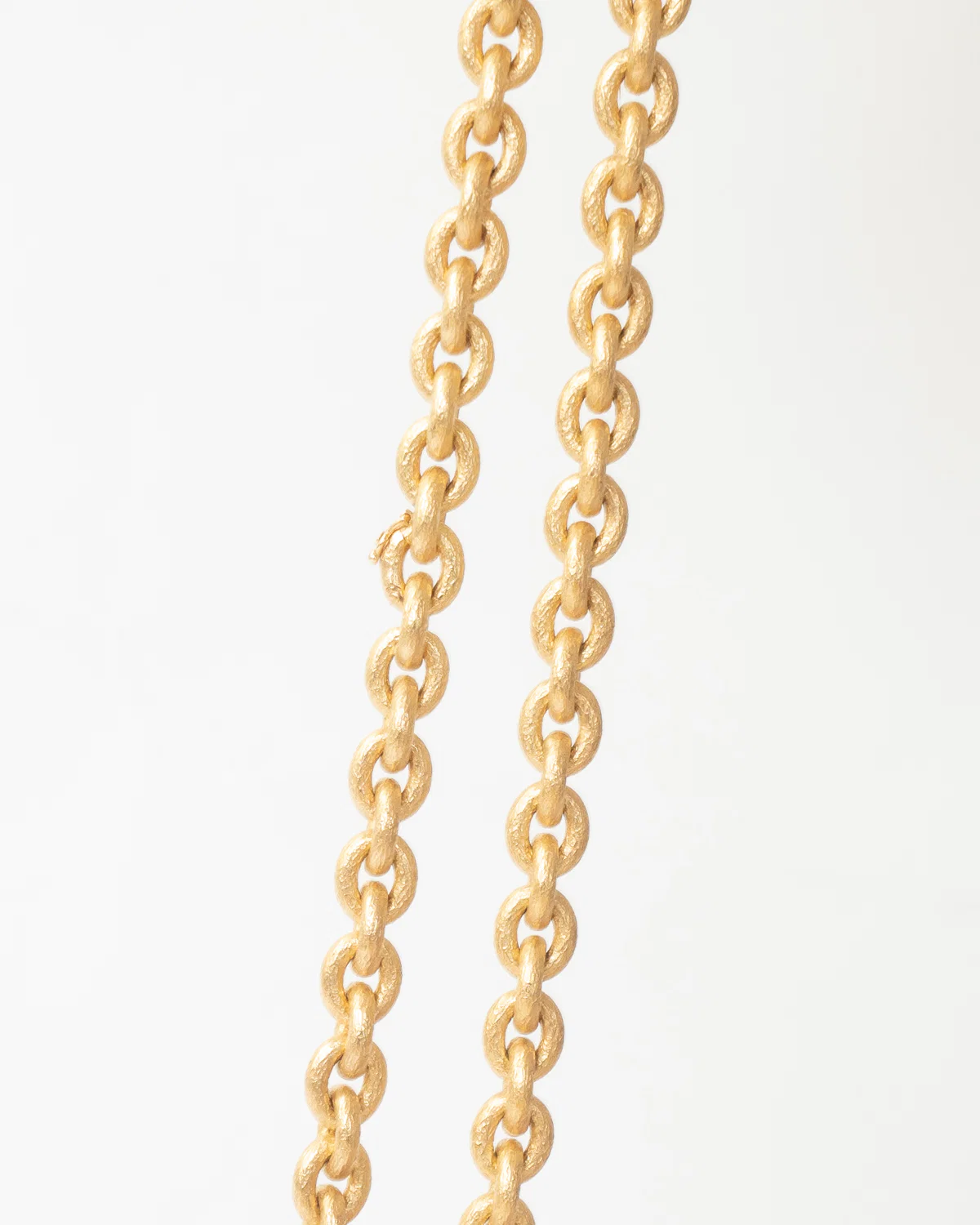 a masterfully crafted subtle brutalist-leaning open chain link necklace with hidden hinged click-closure and extra figure 8 safety clasp. its weighty, its soft, its matte, it glows. its warm in tone both visually and audibly and its hand carved textural surface is just mesmerizing.