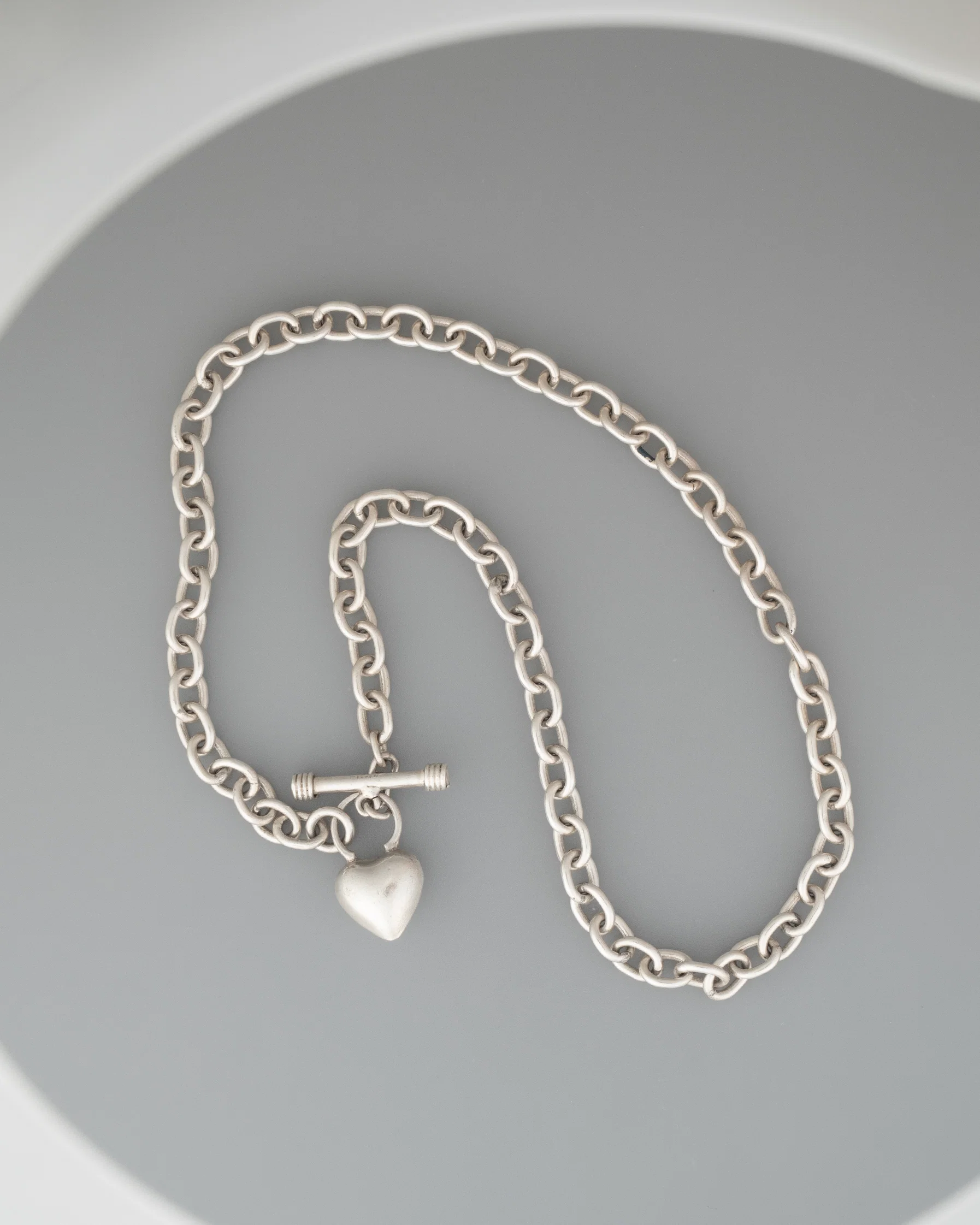 a hand crafted fully soldered sterling silver round rod chain with puffed heart toggle closure.Ā