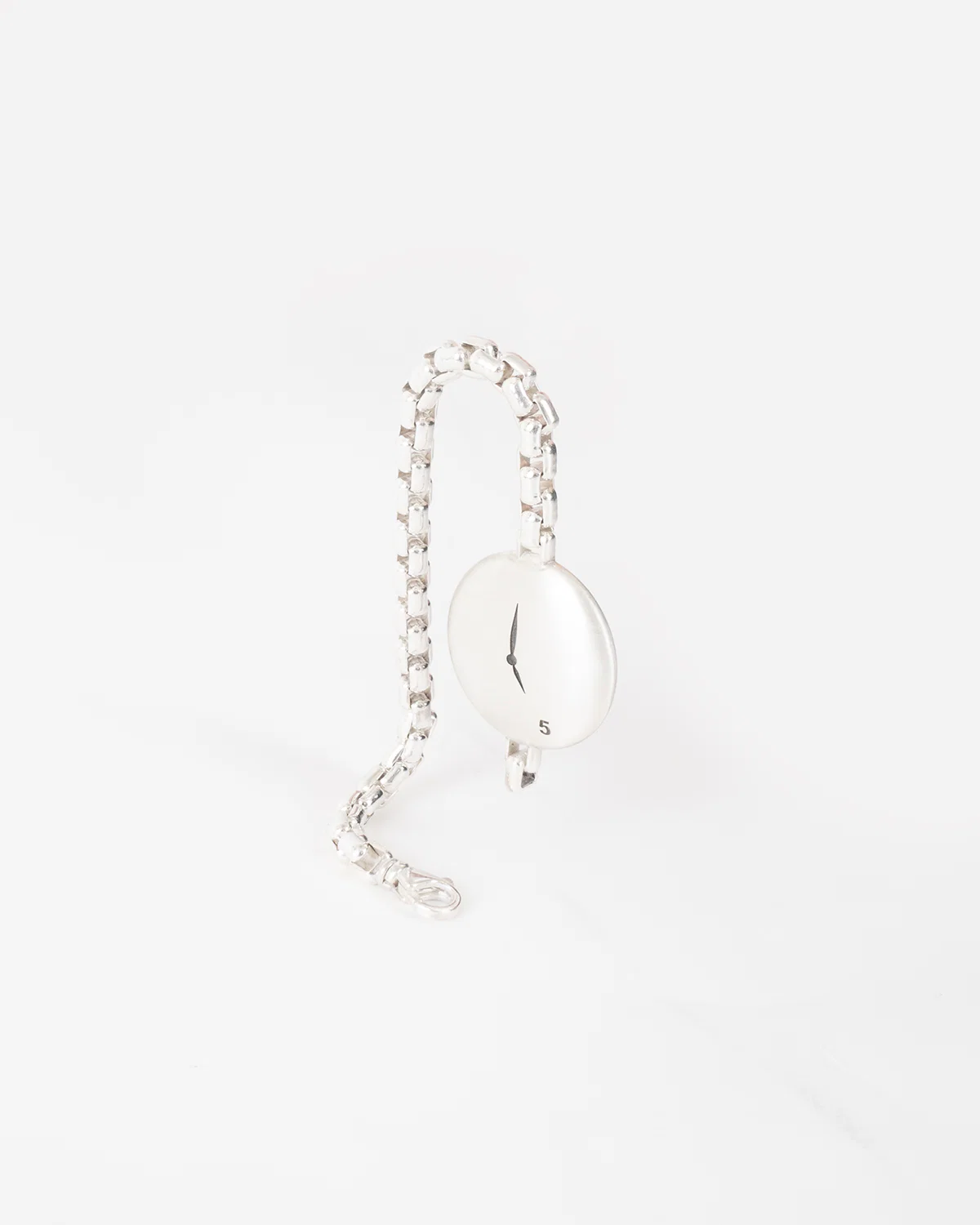 this 925 silver soft box chain lobster clasping bracelet with it's smooth and weighty clock face is made locally in NYC and is available in half inch increments. after casting, each clock face is matte finished by hand, with blackened engravings: 5 o'clock motif on the front, and OJ C00 hallmark on the back. OJ recommends 1" larger than your wrist measure for that true slightly snug weighty watch feeling, or 1.5" larger than your wrist measure if you prefer more movement and a bit of hang.Ā