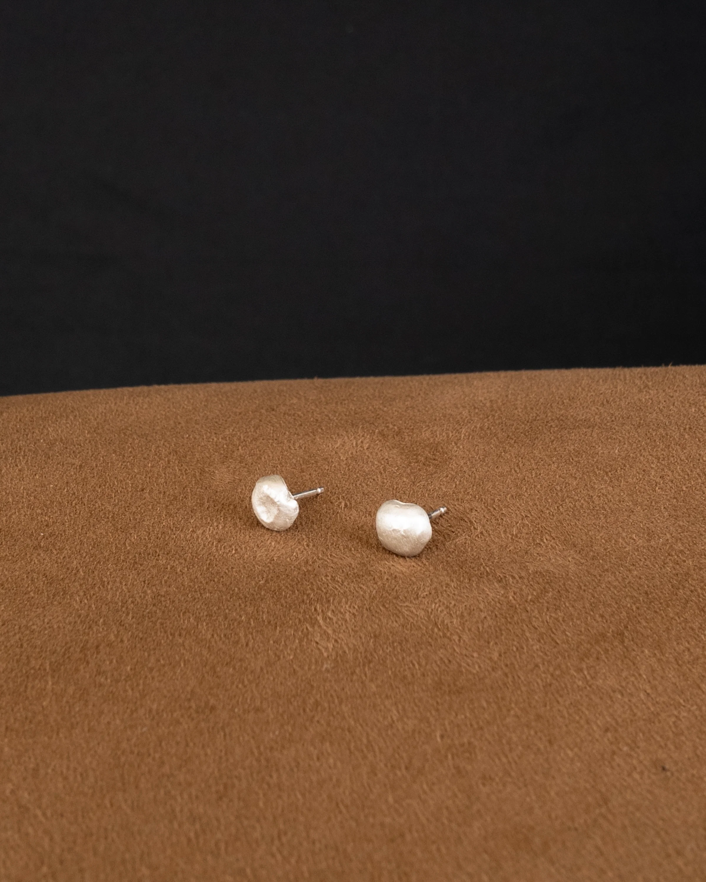 OJ E01 a.k.a. the SPLIT PEA stud earring is a variant of the fourth in-house OLD JEWELRY design: OJ E00. every pea is made from a wax casting of a singular split pea, always irregularly round and sometimes dimpled. each stud is crafted and assembled by hand in solid 925 silver, and finished matte or enameled the perfect pea green, here in New York City.