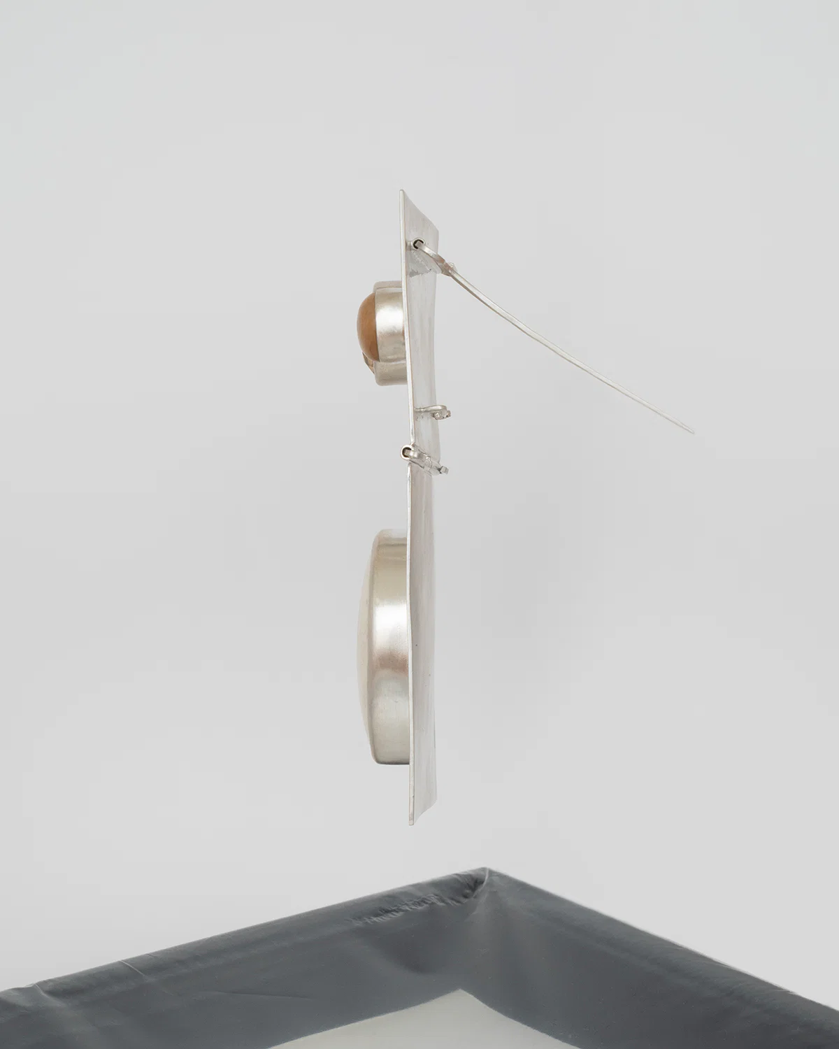a solid sterling silver statement brooch. a thin parallelogram form sliced and hinged asymmetrically - one side with bezel set smoky pale hand cut citrine gem (c1950s) and warm round cabochon of walrus tusk - the other side with a massive bezel set soft ovular slab of near white walrus tusk.