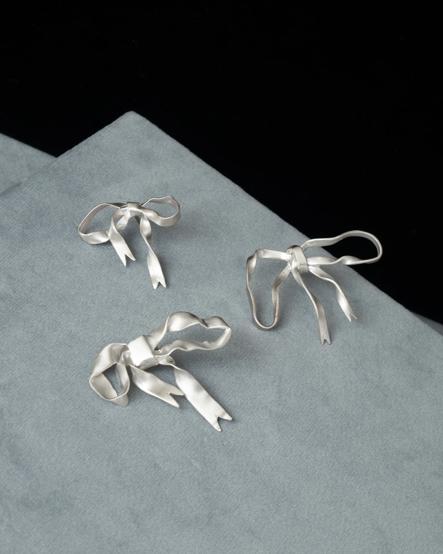 an expressive hand forged, lost wax casted solid sterling silver mid-flop tied ribbon brooch secured with locking pin back.