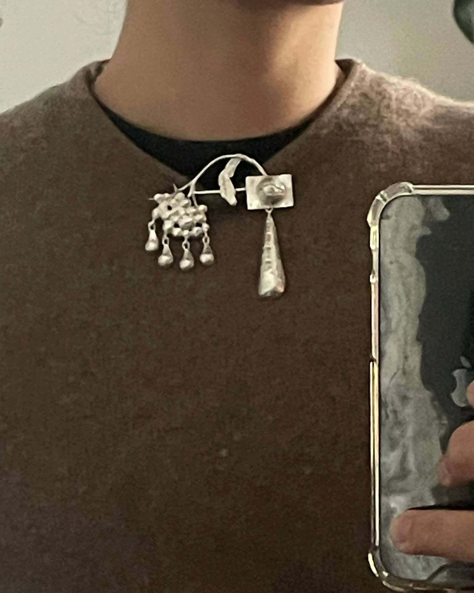 a hand forged and casted sterling silver brooch featuring an eye with a swaying elongated tear drop charm complemented by a dew drop charmed yarrow blossom.Â