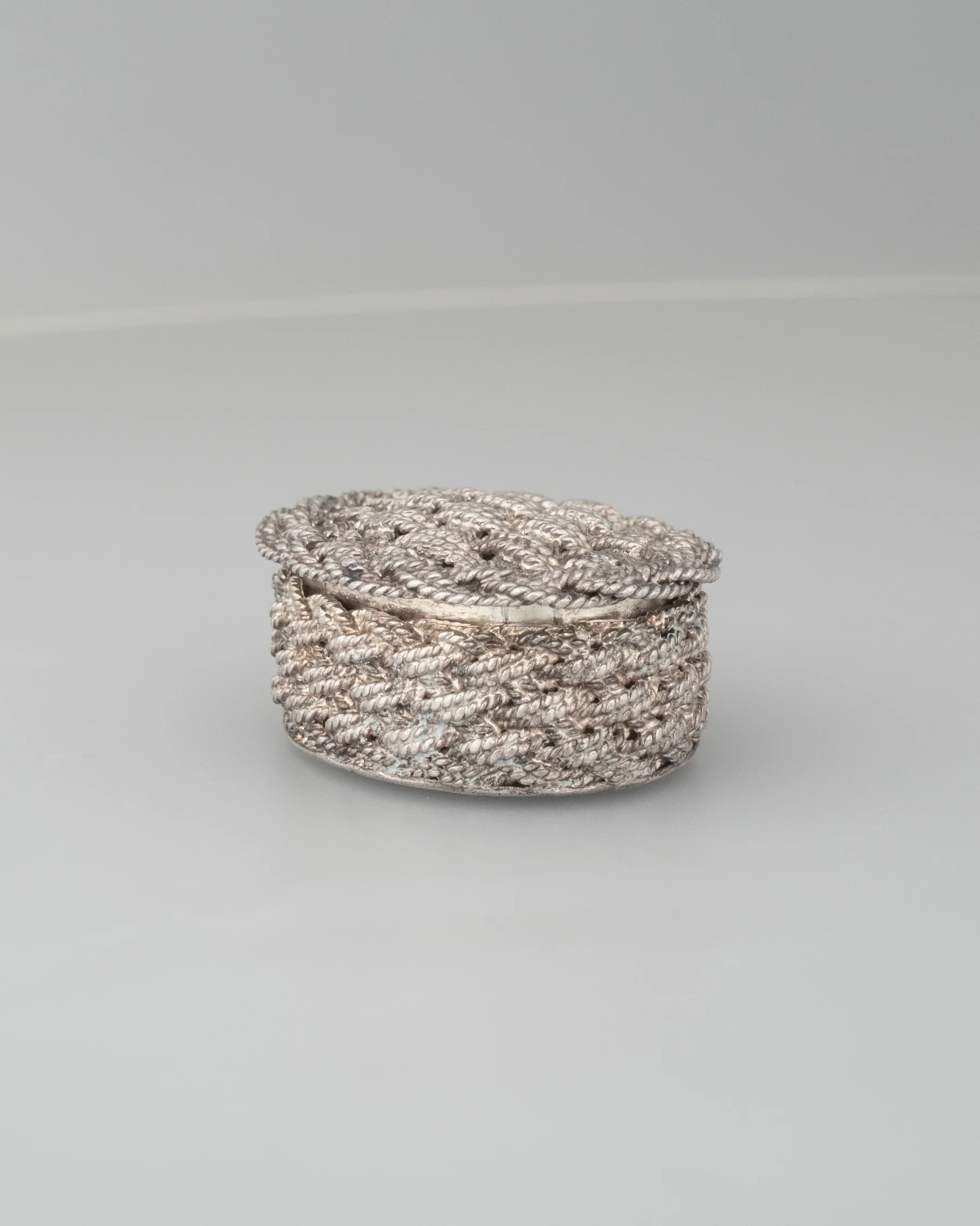 a lost wax casted solid sterling silver twisted and woven ovular pillbox basket with pin hinged top and tension closure.