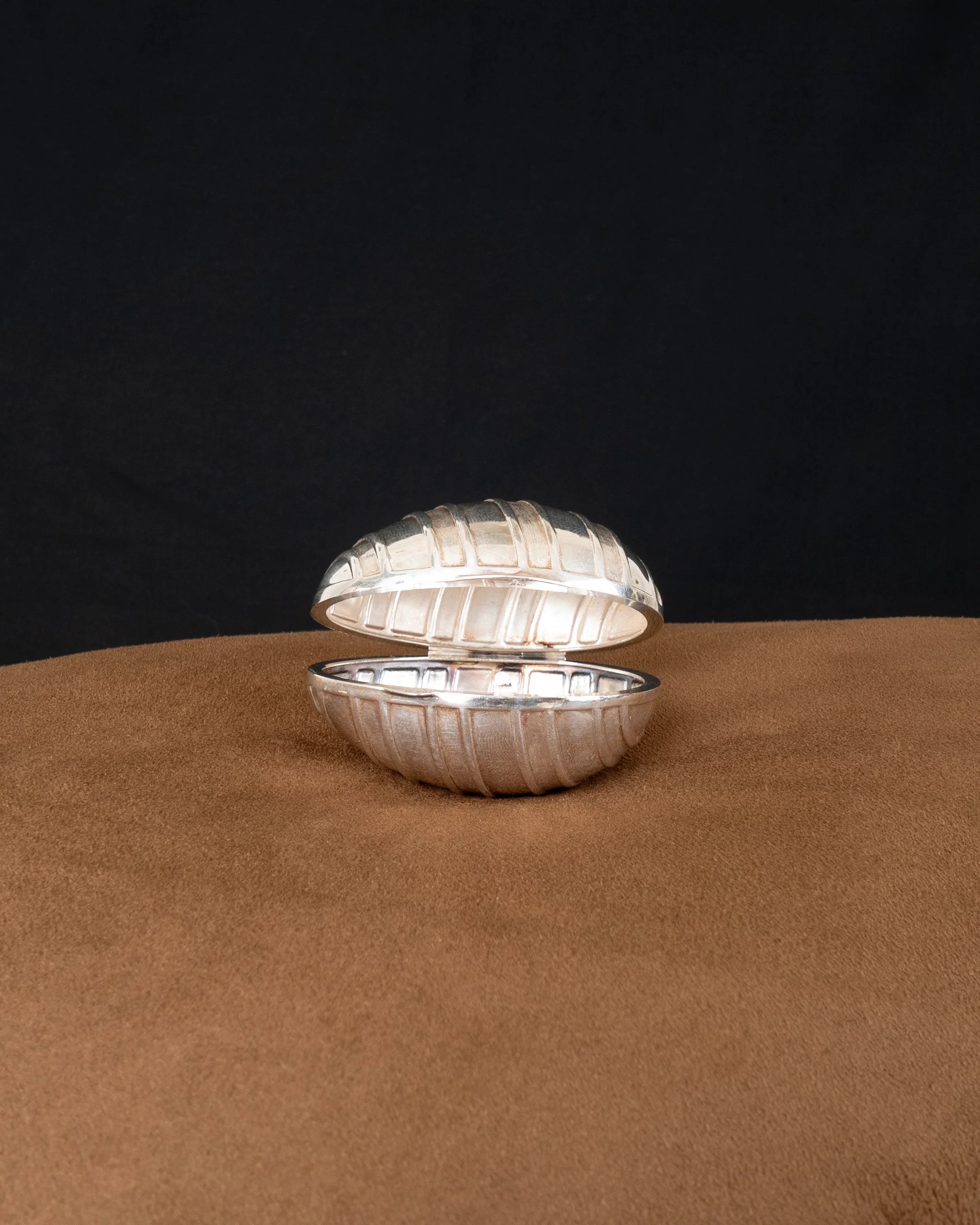a hand crafted Italian chased silver hinged pill box in the form of a stripe decorated egg. look for its companion (vess D2312 aka little egg) - and yes, they nest!Â