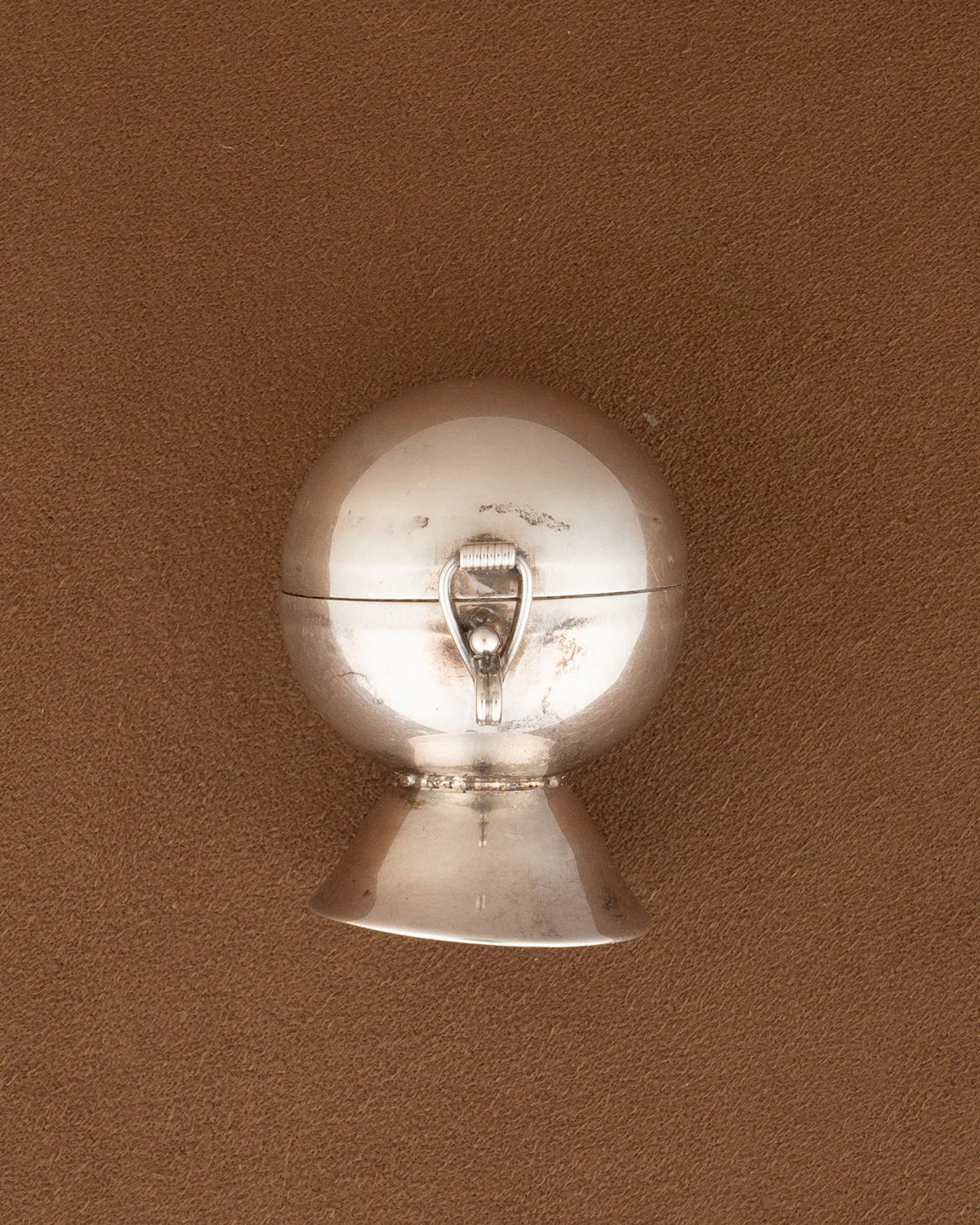 a modernist hand crafted forged sterling silver freestanding bedside pillbox - a hinged hollow orb on a flared round foot with a figure eight safety clasp.Ā
