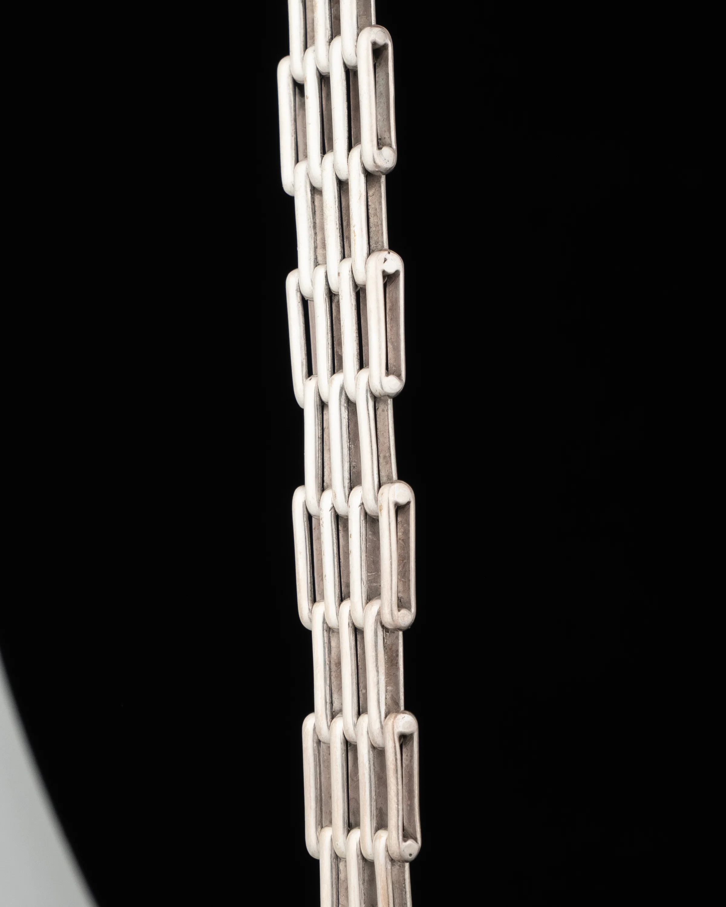 a Taxco crafted and weighty solid sterling silver post modern half-round brick stack linked, pin hinged and highly polished discreet box clasping chain bracelet.