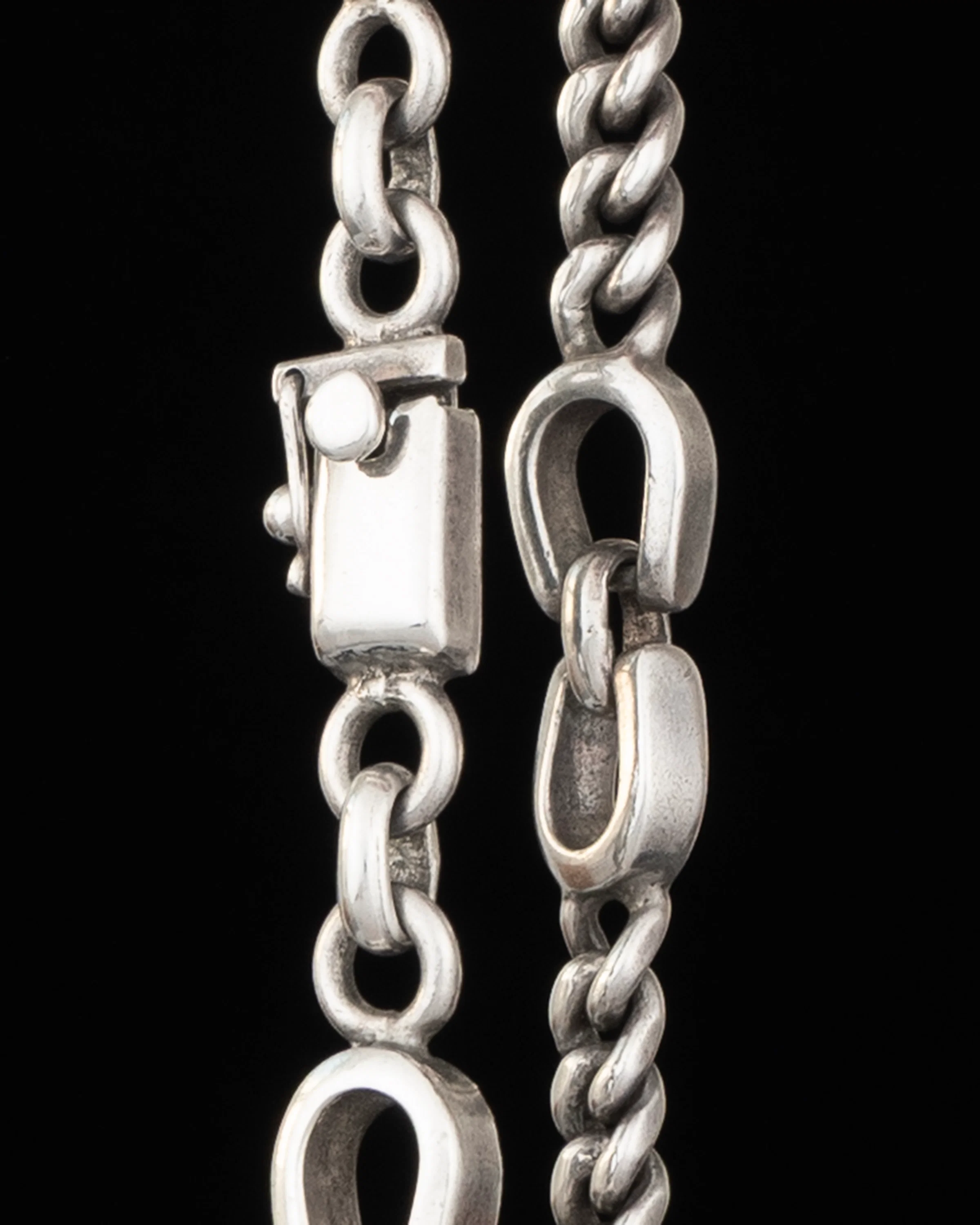 a solid sterling silver Taxco crafted soft and heavy curb chain bracelet with six horse shoe looped features and a secure safety locking box clasp closure.