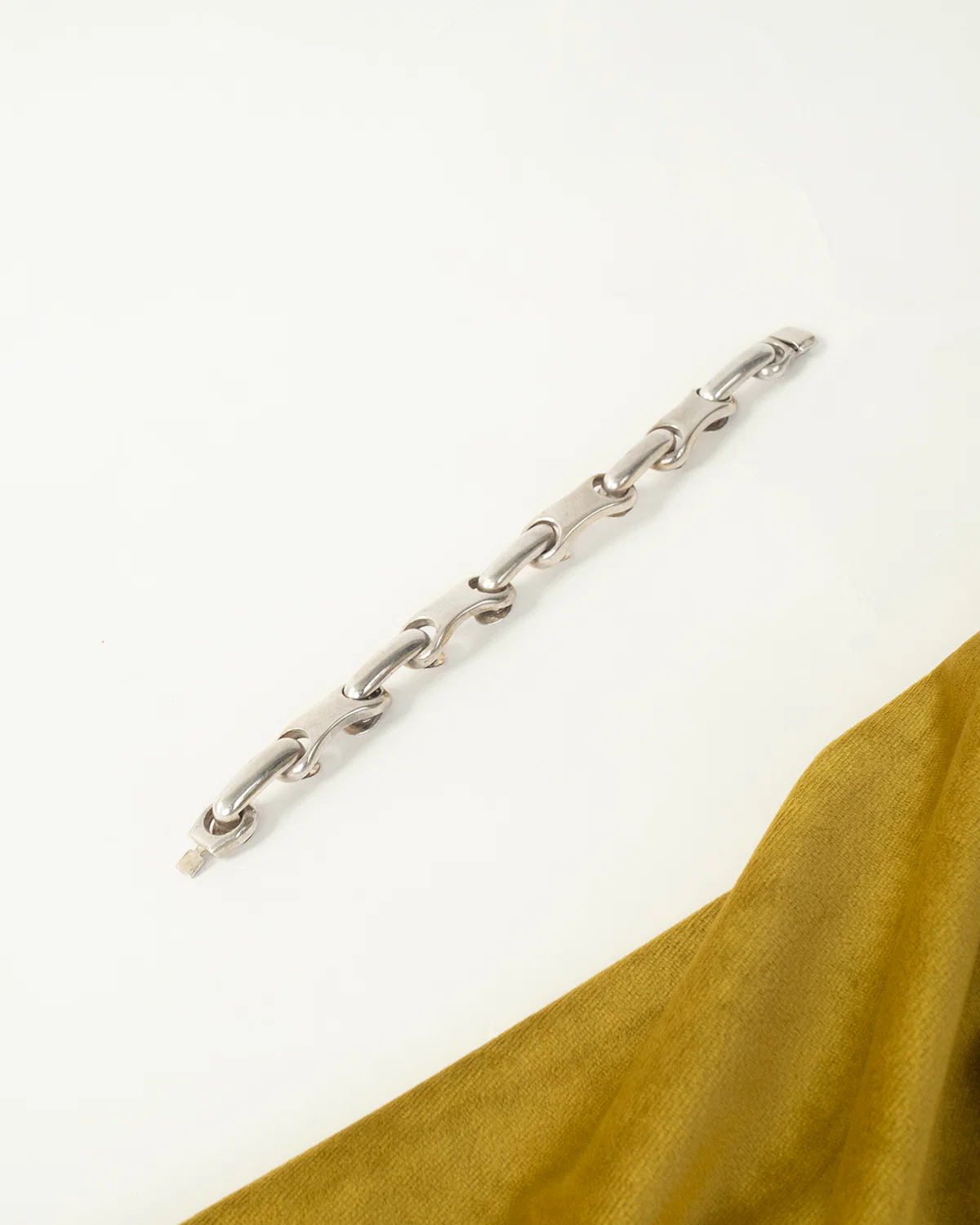 aĀ substantial solid silver studio craft modernist bracelet - telephones in profile, peanuts in plan and bike chains from below - this hand crafted chain with custom clicking clasp is weighty in concept and on the scale too.