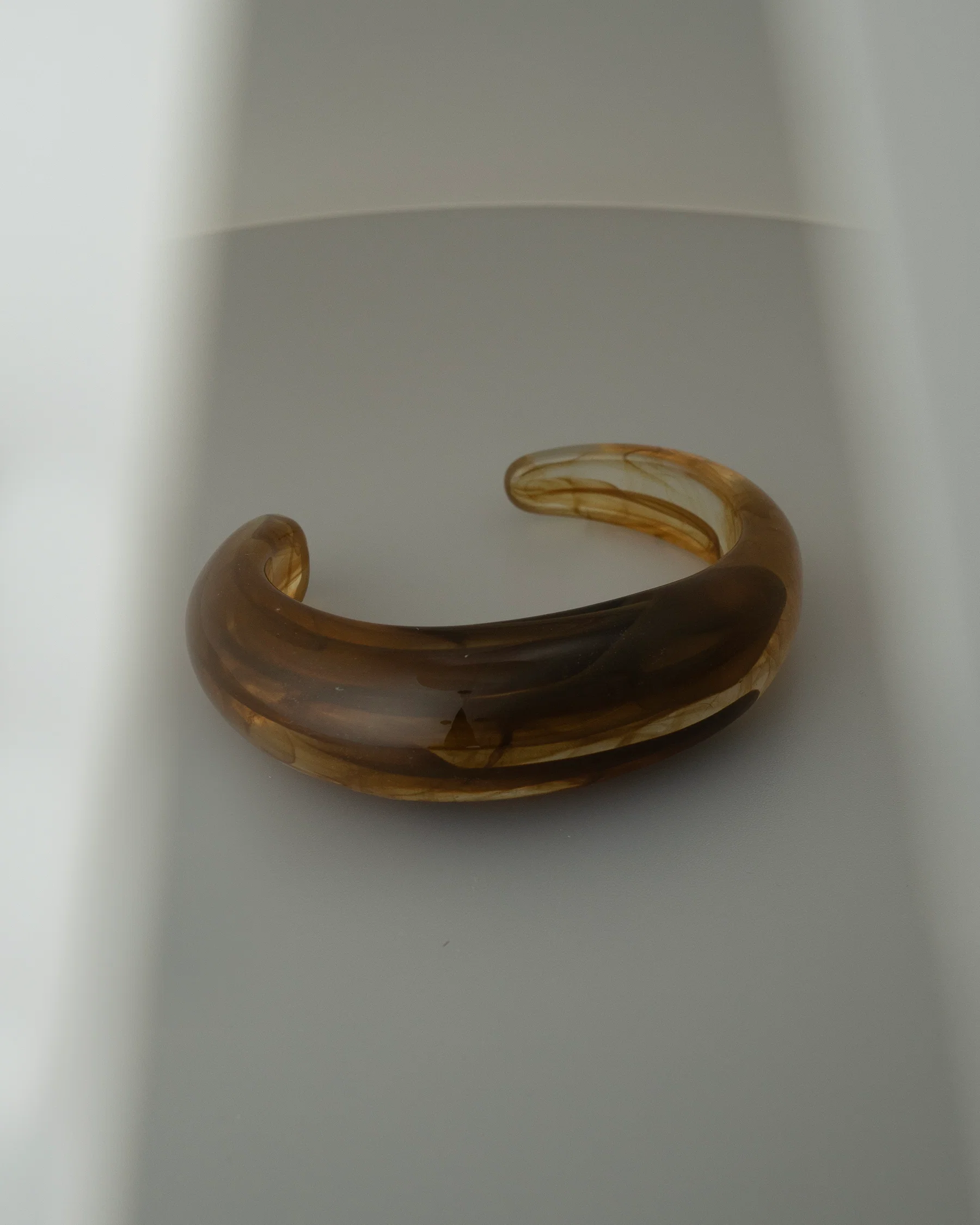 a smoky haze trapped warm brown domed lucite cuff with bitsy rhinestone hidden inside the interior of the cuff, a little secret for the wearer.Ā