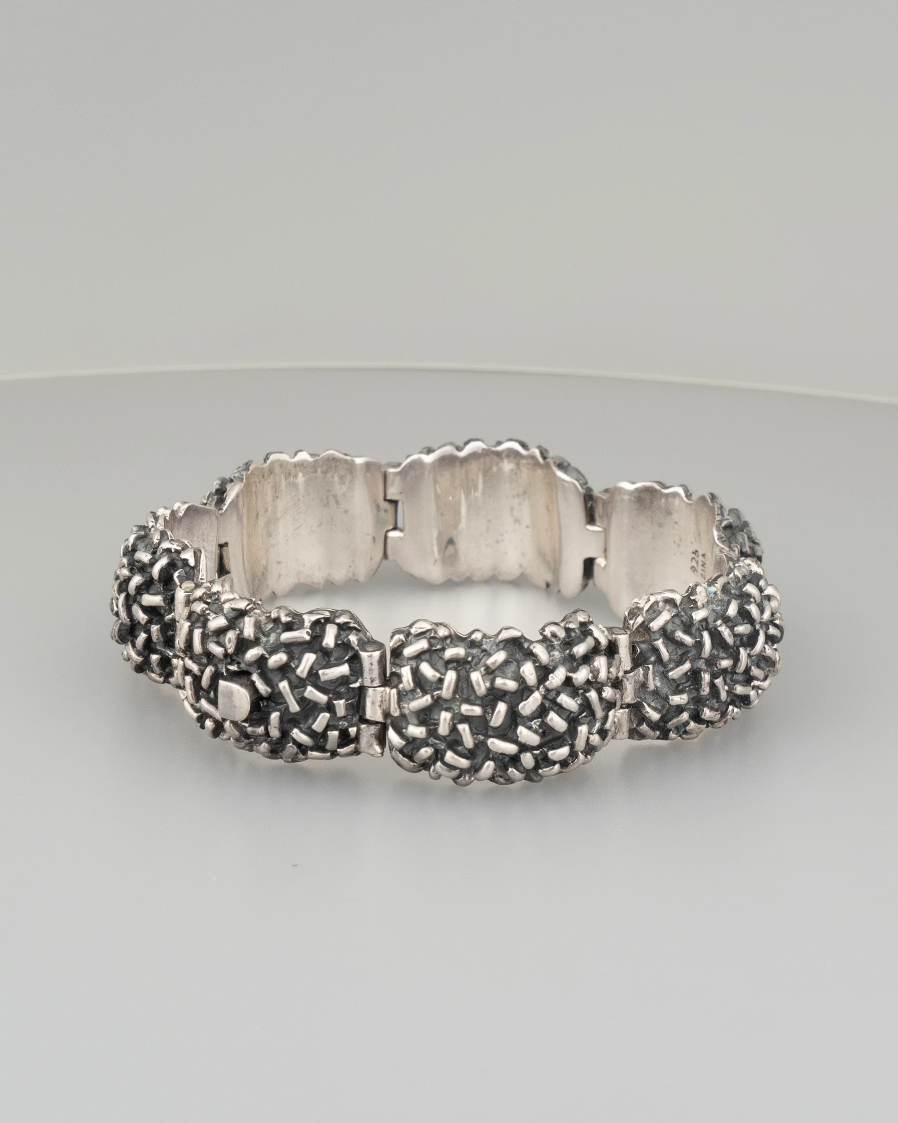 a hand crafted post modern solid and weighty confetti covered segmented and hinged oxidized box clasping bracelet.
